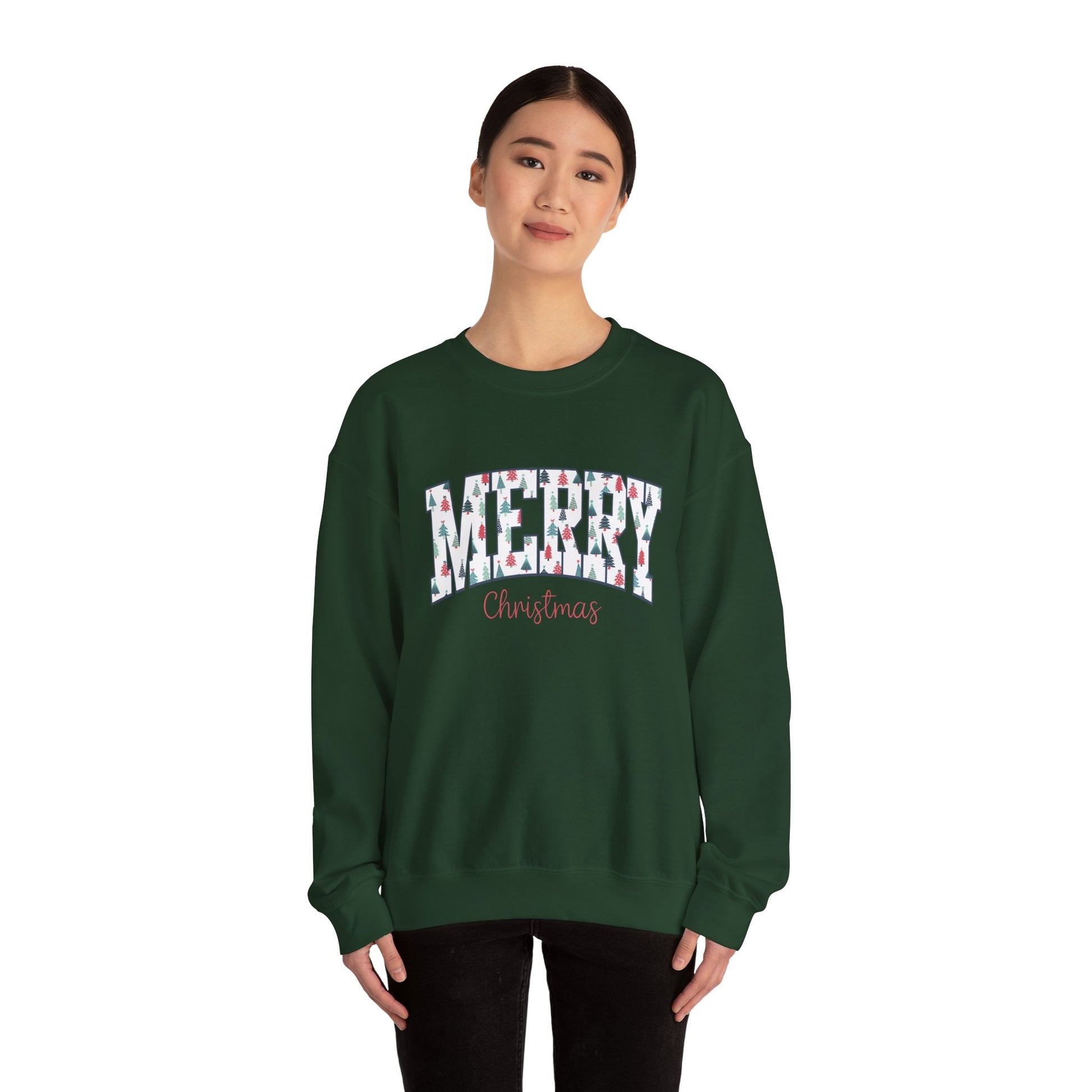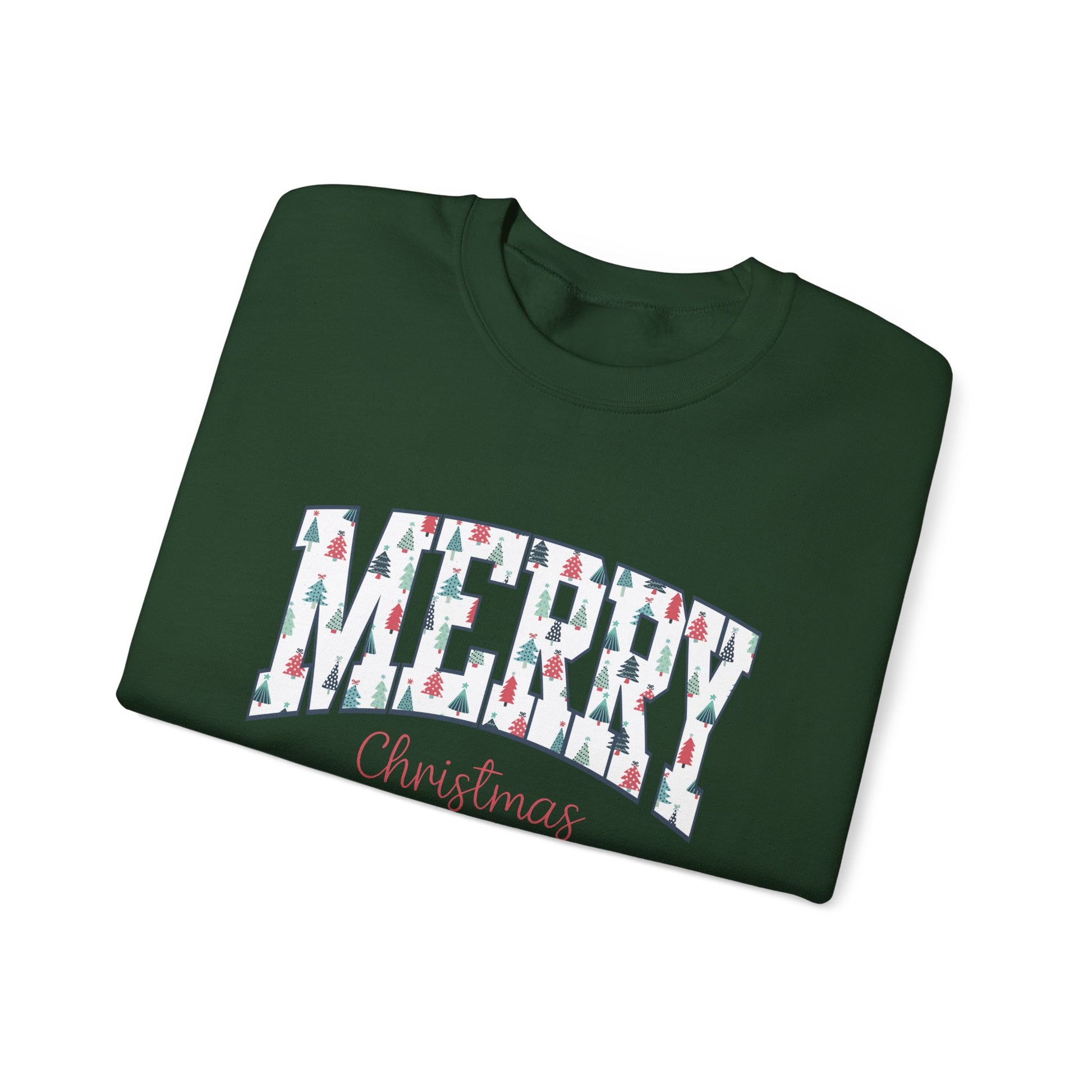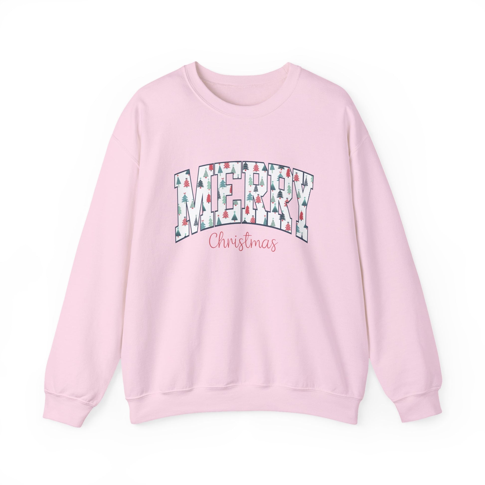 A festive crewneck sweatshirt featuring Merry Christmas block letters, perfect for spreading holiday cheer. This unisex sweatshirt is designed for adults, providing comfort and durability with a classic fit and double-needle stitching. Ideal for those looking to stay cozy and stylish during the Christmas season.